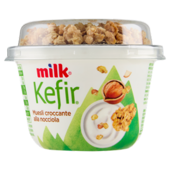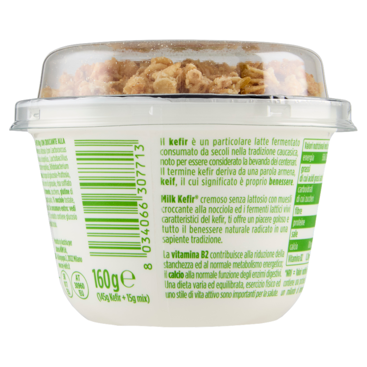 Il kefir è un particolare latte fermentato consumato da secoli nella tradizione caucasica, noto per essere considerato la bevanda dei centenari. Il termine kefir deriva da una parola armena, keif, il cui significato è proprio benessere. Kefir cremoso Milk, con crema di latte senza lattosio, muesli croccante alla nocciola ed i fermenti lattici vivi caratteristici del kefir, ti offre un piacere goloso e tutto il benessere naturale radicato in una sapiente tradizione. La vitamina B12 contribuisce alla riduzione della stanchezza e, come la vitamina A, al normale funzionamento del sistema immunitario; il calcio alla normale funzione degli enzimi digestivi. Una dieta varia ed equilibrata, esercizio fisico ed uno stile di vita attivo sono importanti per la salute. Il prodotto contiene glucosio e galattosio in conseguenza della scissione del lattosio.