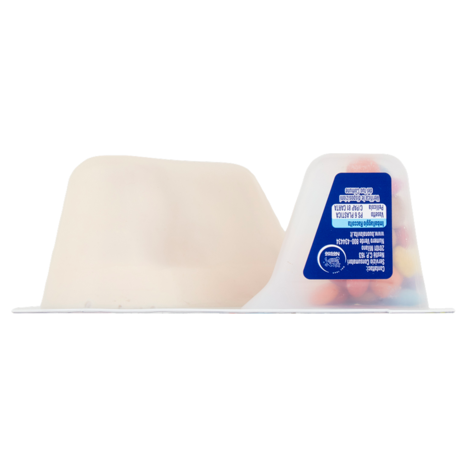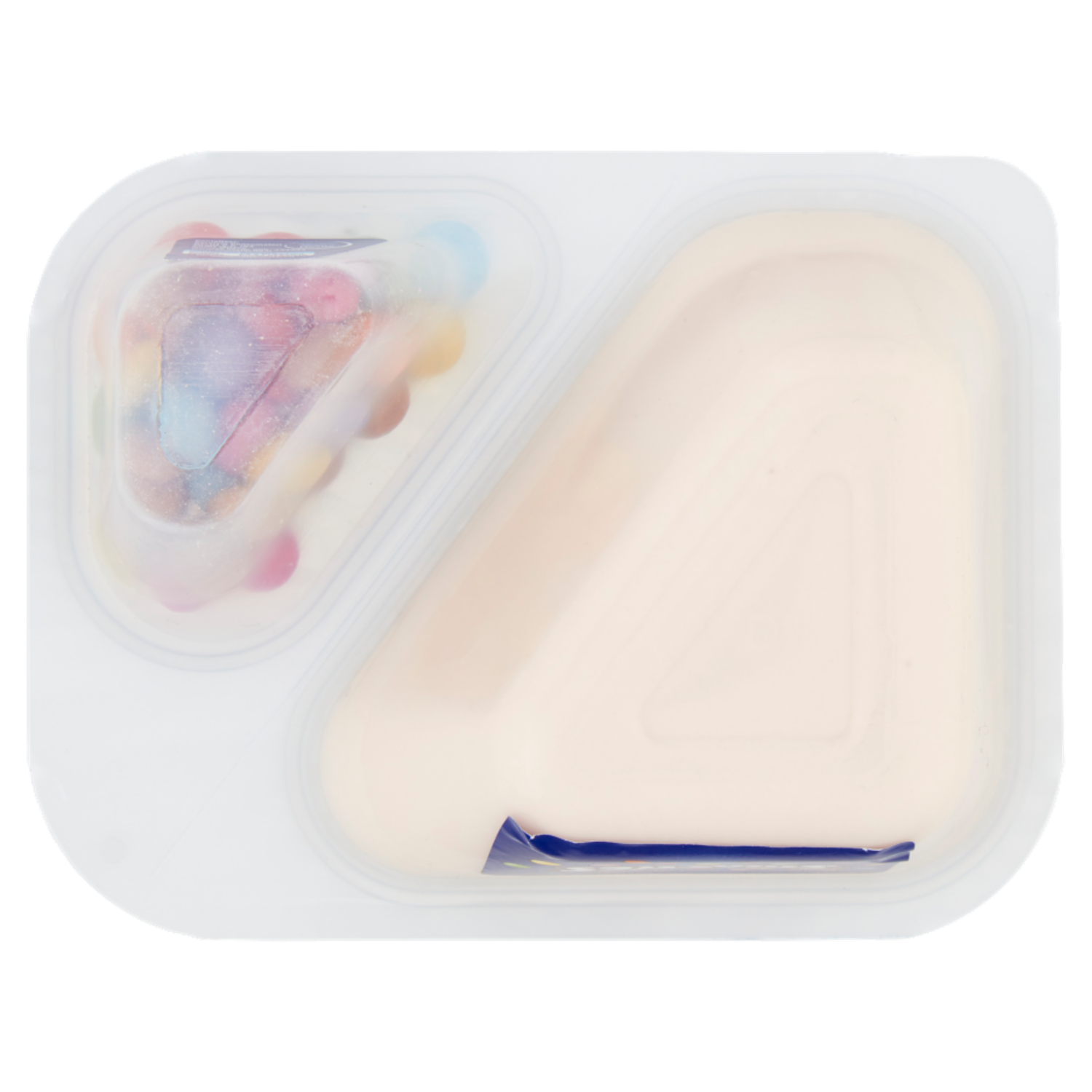 Yogurt zuccherato con preparazione alla fragola (7%) e confetti ripieni di cioccolato al latte (11%)