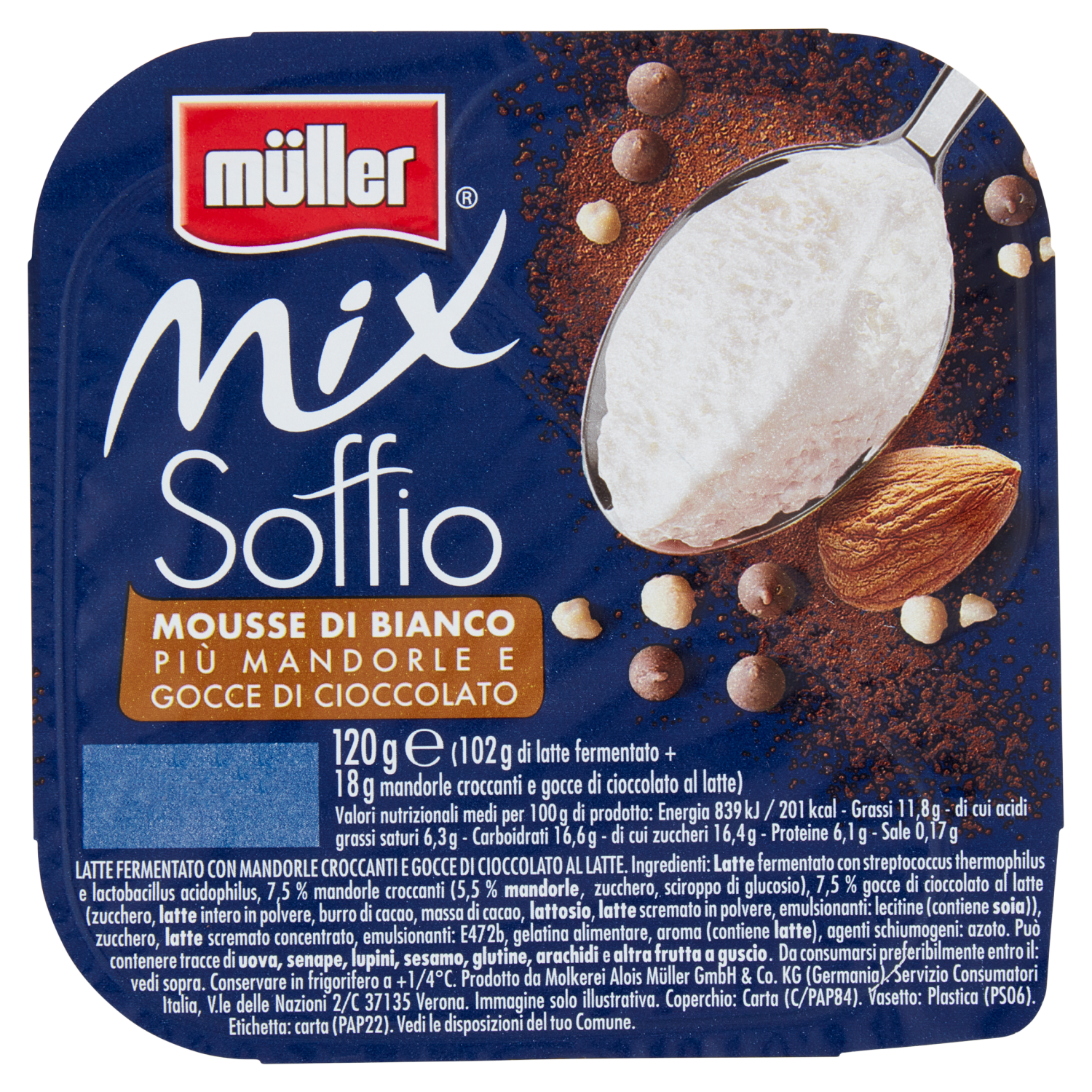 Latte fermentato con 8% mandorle croccanti e 8% gocce di cioccolato al latte
