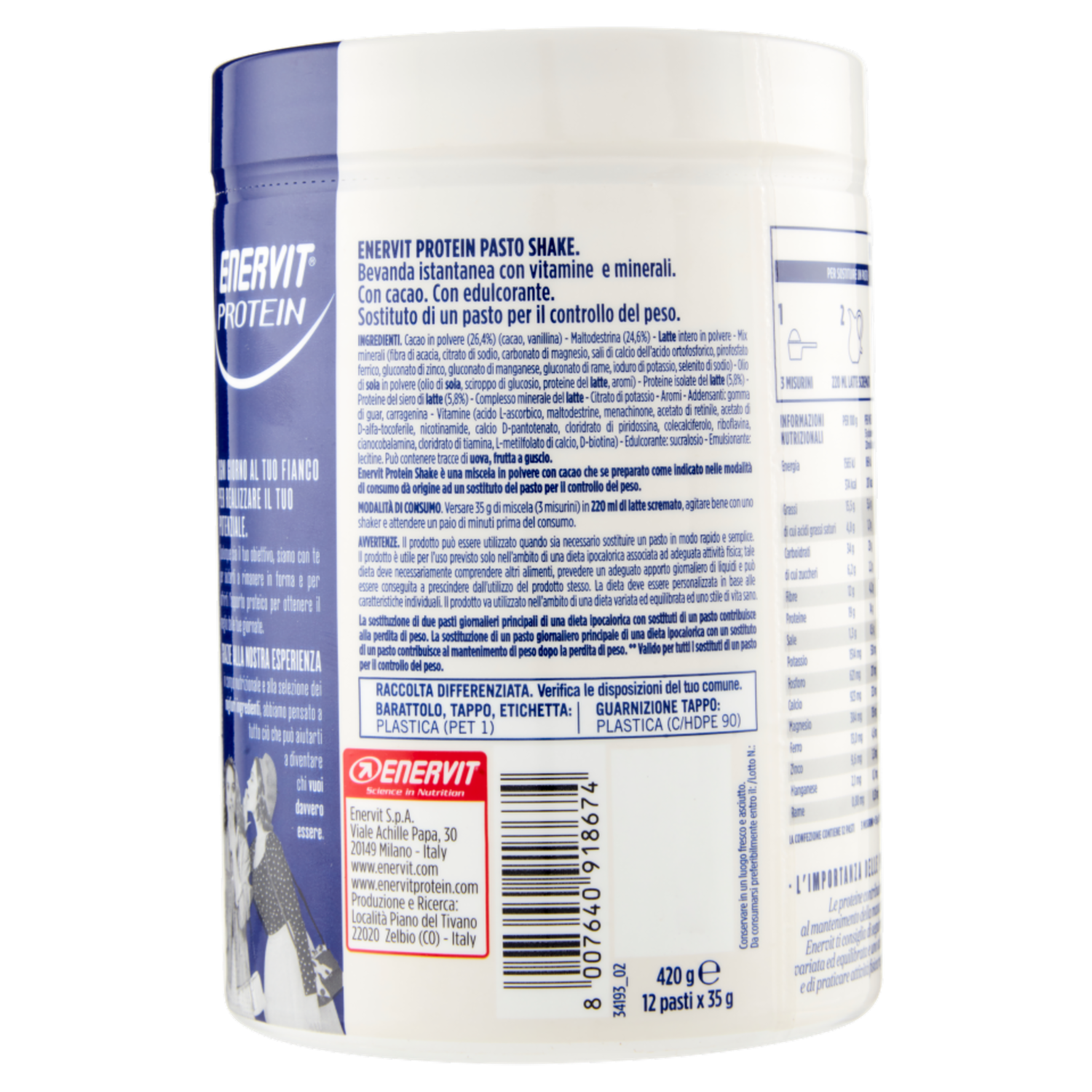 Enervit Protein Shake è una miscela in polvere con cacao che se preparato come indicato nelle modalità di consumo dà origine ad un sostituto del pasto per il controllo del peso. La sostituzione di due pasti giornalieri principali di una dieta ipocalorica con sostituti di un pasto contribuisce alla perdita di peso. La sostituzione di un pasto giornaliero principale di una dieta ipocalorica con un sostituto di un pasto contribuisce al mantenimento di peso dopo la perdita di peso. L'importanza delle proteine Le proteine contribuiscono al mantenimento della massa muscolare. Enervit ti consiglia di seguire una dieta variata ed equilibrata e uno stila di vita sano e di praticare attività fisica regolarmente. Ricco di Proteine** - 20% del valore energetico con Proteine da Latte, da Cacao **Valido per tutti i sostituti di un pasto per il controllo del peso.