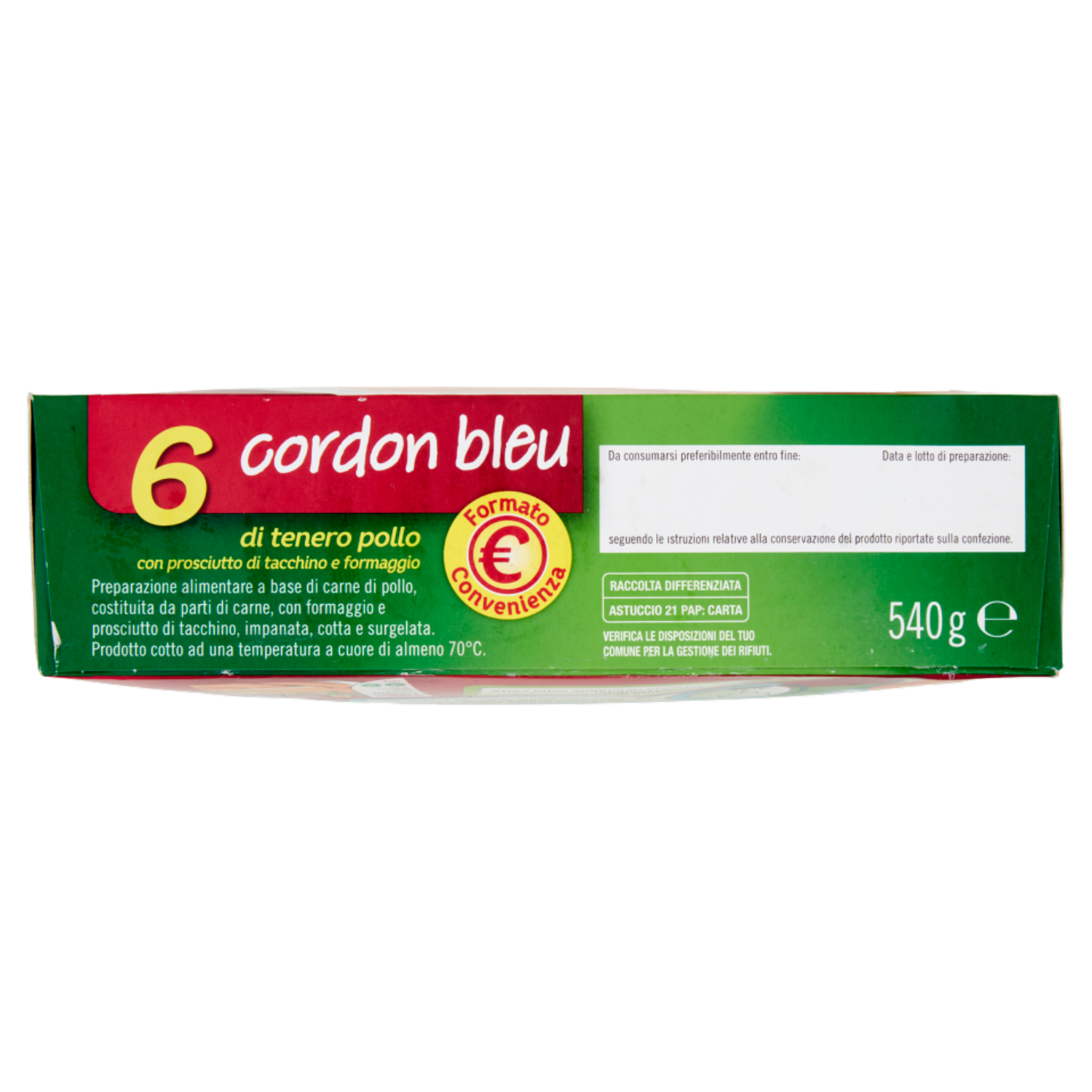 Preparazione alimentare a base di carne di pollo, costituita da parti di carne, con formaggio e prosciutto di tacchino, impanata, cotta e surgelata. Prodotto cotto ad una temperatura a cuore di almeno 70°C