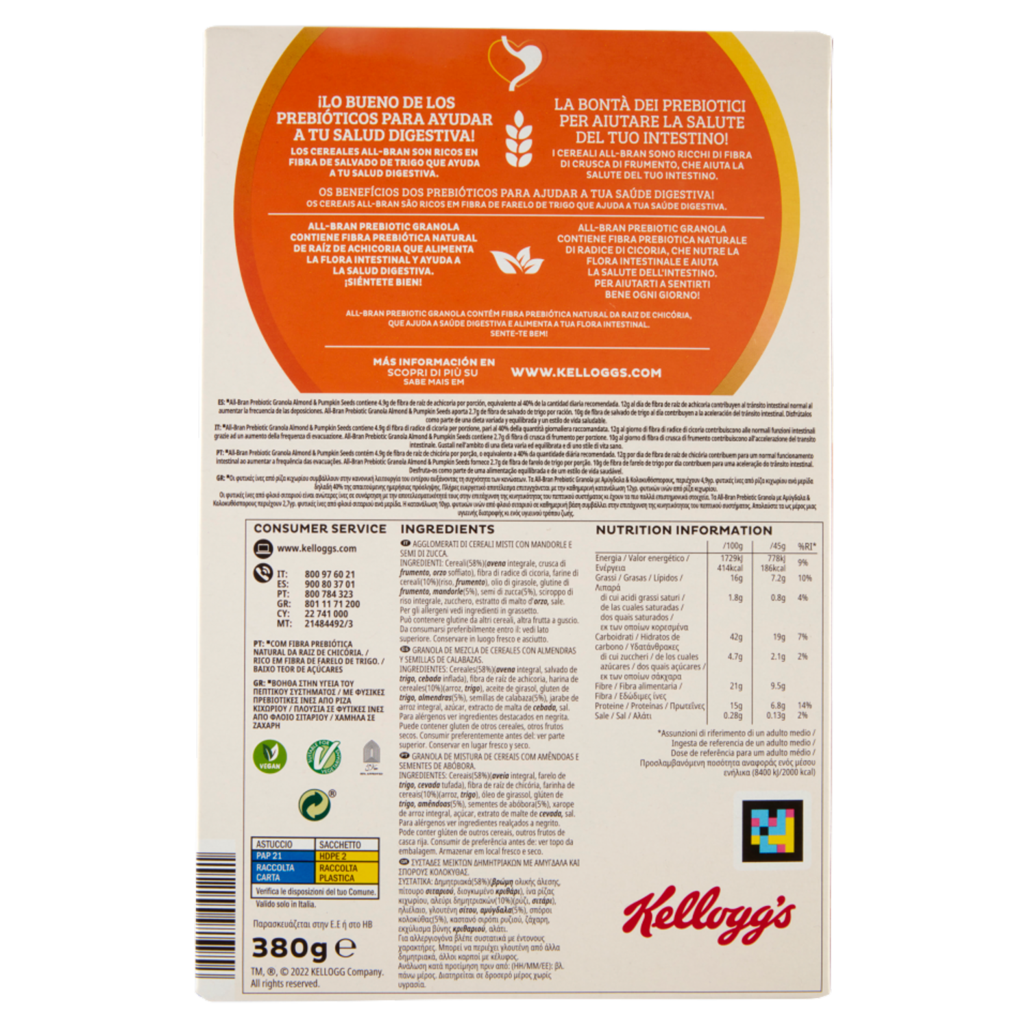 La bontà dei prebiotici per aiutare la salute del tuo intestino! I cereali All-Bran sono ricchi di fibra di crusca di frumento, che aiuta la salute del tuo intestino. All-Bran Prebiotic Granola contiene fibra prebiotica naturale di radice di cicoria, che nutre la flora intestinale e aiuta la salute dell'intestino. Per aiutarti a sentirti bene ogni giorno! Scopri di più su www.kelloggs.com Aiuta la salute del tuo intestino° Con fibra prebiotica naturale di radice di cicoria° Ricco di fibra di crusca di frumento A basso contenuto di zuccheri °All-Bran Prebiotic Granola Almond & Pumpkin Seeds contiene 4.9g di fibra di radice di cicoria per porzione, pari al 40% della quantità giornaliera raccomandata. 12g al giorno di fibra di radice di cicoria contribuiscono alle normali funzioni intestinali grazie ad un aumento della frequenza di evacuazione. All-Bran Prebiotic Granola Almond & Pumpkin Seeds contiene 2.7g di fibra di crusca di frumento per porzione. 10g al giorno di fibra di crusca di frumento contribuiscono all'accelerazione del transito intestinale. Gustali nell'ambito di una dieta varia ed equilibrata e di uno stile di vita sano.