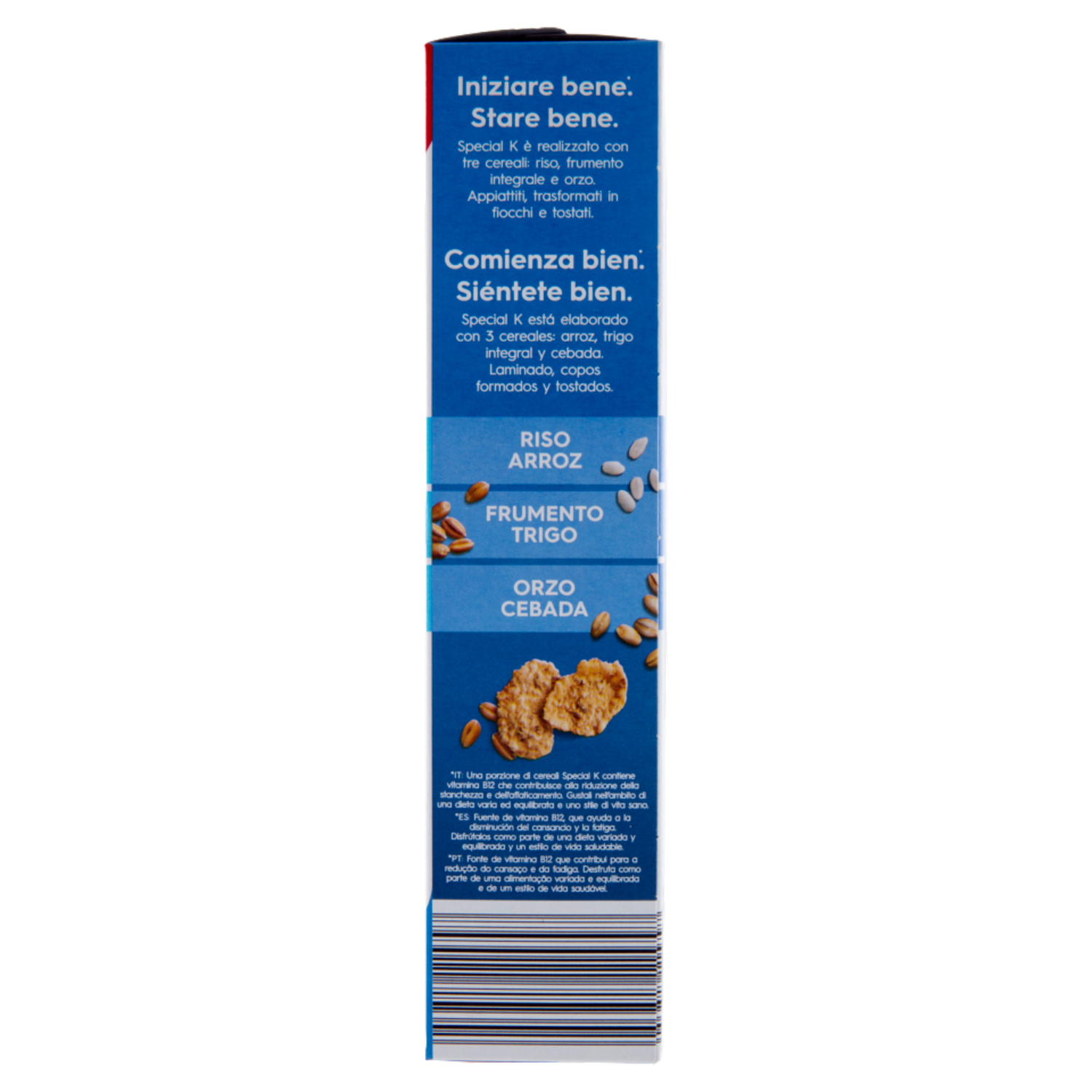 Iniziare bene*. Stare bene. Il segreto per una buona giornata è un buon inizio. Gustosi e croccanti fiocchi con frumento integrale, riso e orzo. Cereali dalla natura Senza coloranti né aromi artificiali Senza conservanti Iniziare bene*. Stare bene. Special K è realizzato con tre cereali: riso, frumento integrale e orzo. Appiattiti, trasformati in fiocchi e tostati. Riso Frumento Orzo *Una porzione di cereali Special K contiene vitamina B12 che contribuisce alla riduzione della stanchezza e dell'affaticamento. Gustali nell'ambito di una dieta varia ed equilibrata e uno stile di vita sano.