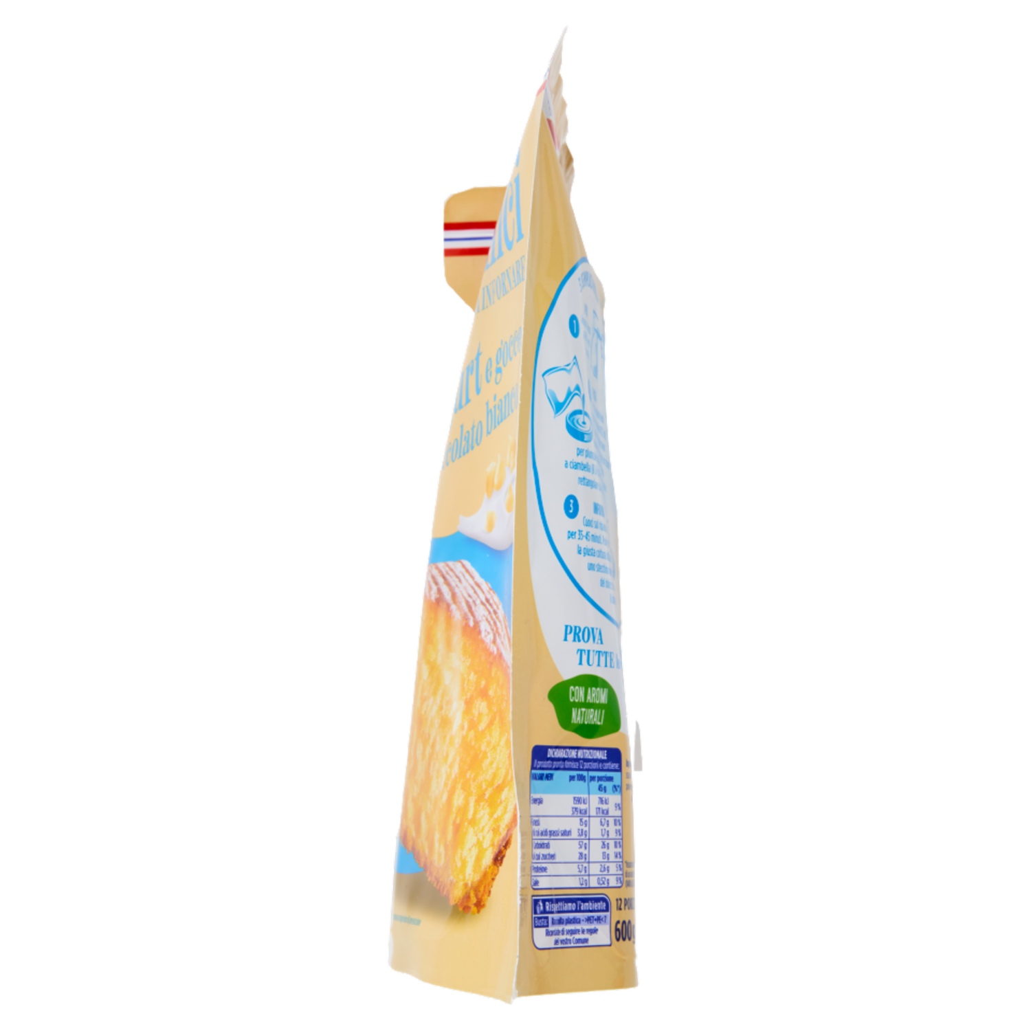 In pochi minuti la bontà e il profumo di un dolce fatto in casa! 3 Semplici mosse 1 Apri Accendi il forno a 165°C e apri la busta. 2 Versa Imburra e infarina fondo e bordo di una tortiera (Ø 22 cm). Versa l'impasto nello stampo e livellalo. Puoi usare anche uno stampo per plumcake lungo 25 cm, uno stampo a ciambella (Ø 24 cm) o uno stampo di alluminio rettangolare da 4 porzioni (17X22 cm). 3 Inforna Cuoci sul ripiano inferiore per 35-45 minuti. Puoi verificare la giusta cottura infilando uno stecchino nel centro del dolce: se resta pulito, il dolce è pronto. Muffin Accendi il forno a 165°C e distribuisci l'impasto in 12 stampi (Ø 7 cm). Cuoci su una teglia posta sul ripiano medio del forno per 25-30 minuti e verifica la cottura con uno stecchino. Per le feste Puoi usare 2 confezioni, anche di gusti diversi, in una tortiera più grande (Ø 28-30 cm) cuocendo la torta a 165°C per 55-65 minuti. Il tuo tocco creativo Prima della cottura puoi guarnire la superficie della torta con mandorle affettate, nocciole o noci tritate non troppo fini o frutta fresca tagliata a fettine sottili. Dopo la cottura puoi farcire la torta con marmellata di ribes. Puoi anche decorare la superficie con zucchero al velo o rametti di ribes. Conservare il prodotto pronto per il consumo in un luogo fresco e asciutto e consumare entro 2 giorni.