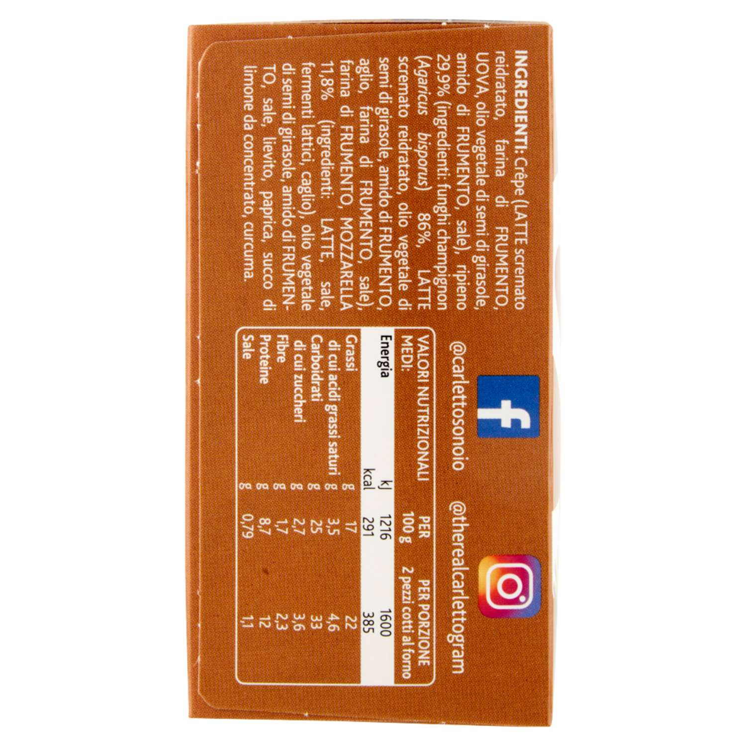 Ripieno 29,9% (ingredienti: funghi champignon (Agaricus bisporus) 86%, latte scremato reidratato, olio vegetale di semi di girasole, amido di frumento, aglio, farina di frumento, sale)