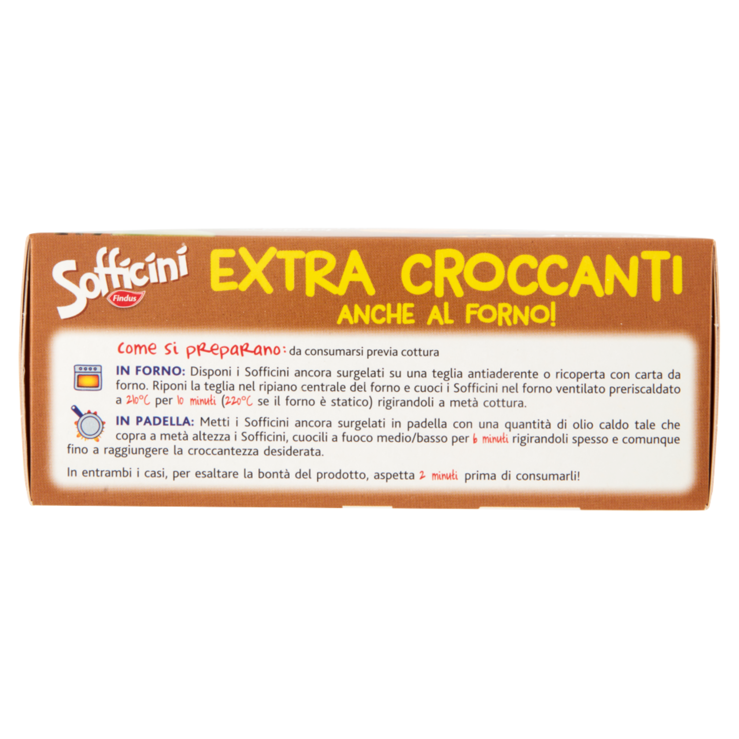 Extra croccanti anche al forno! Come si preparano: da consumarsi previa cottura In forno: Disponi i Sofficini ancora surgelati su una teglia antiaderente o ricoperta con carta da forno. Riponi la teglia nel ripiano centrale del forno e cuoci i Sofficini nel forno ventilato preriscaldato a 210°C per 10 minuti (220°C se il forno è statico) rigirandoli a metà cottura. In padella: Metti i Sofficini ancora surgelati in padella con una quantità di olio caldo tale che copra a metà altezza i Sofficini, cuocili a fuoco medio/basso per 6 minuti rigirandoli spesso e comunque fino a raggiungere la croccantezza desiderata. In entrambi i casi, per esaltare la bontà del prodotto, aspetta 2 minuti prima di consumarli!