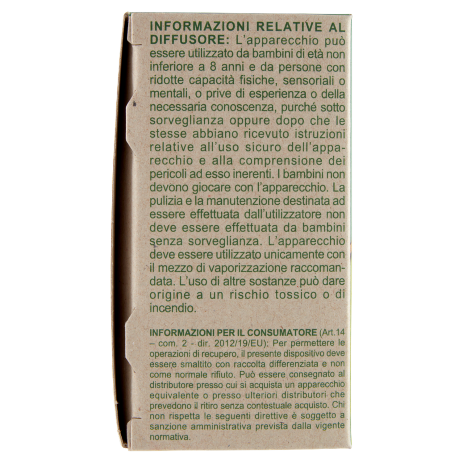 Modalità d'uso: 1. Inserire la piastrina in pura cellulosa nell'apposito elettro diffusore. Si consiglia di utilizzare gli elettroemanatori Vape, che emanano a temperatura controllata e garantiti a vita. 2. Inserire la spina del dispositivo in una presa di corrente. 3. Per un'efficacia ottimale, lasciare uno spazio libero di almeno 60 cm intorno al dispositivo. 4. La piastrina perde il suo colore durante le 12 ore di durata, diventando infine bianca. Informazioni relative al diffusore: L'apparecchio può essere utilizzato da bambini di età non inferiore a 8 anni e da persone con ridotte capacità fisiche, sensoriali o mentali, o prive di esperienza o della necessaria conoscenza, purché sotto sorveglianza oppure dopo che le stesse abbiano ricevuto istruzioni relative all'uso sicuro dell'apparecchio e alla comprensione dei pericoli ad esso inerenti. I bambini non devono giocare con l'apparecchio. La pulizia e la manutenzione destinata ad essere effettuata dall'utilizzatore non deve essere effettuata da bambini senza sorveglianza. L'apparecchio deve essere utilizzato unicamente con il mezzo di vaporizzazione raccomandata. L'uso di altre sostanze può dare origine a un rischio tossico o di incendio.