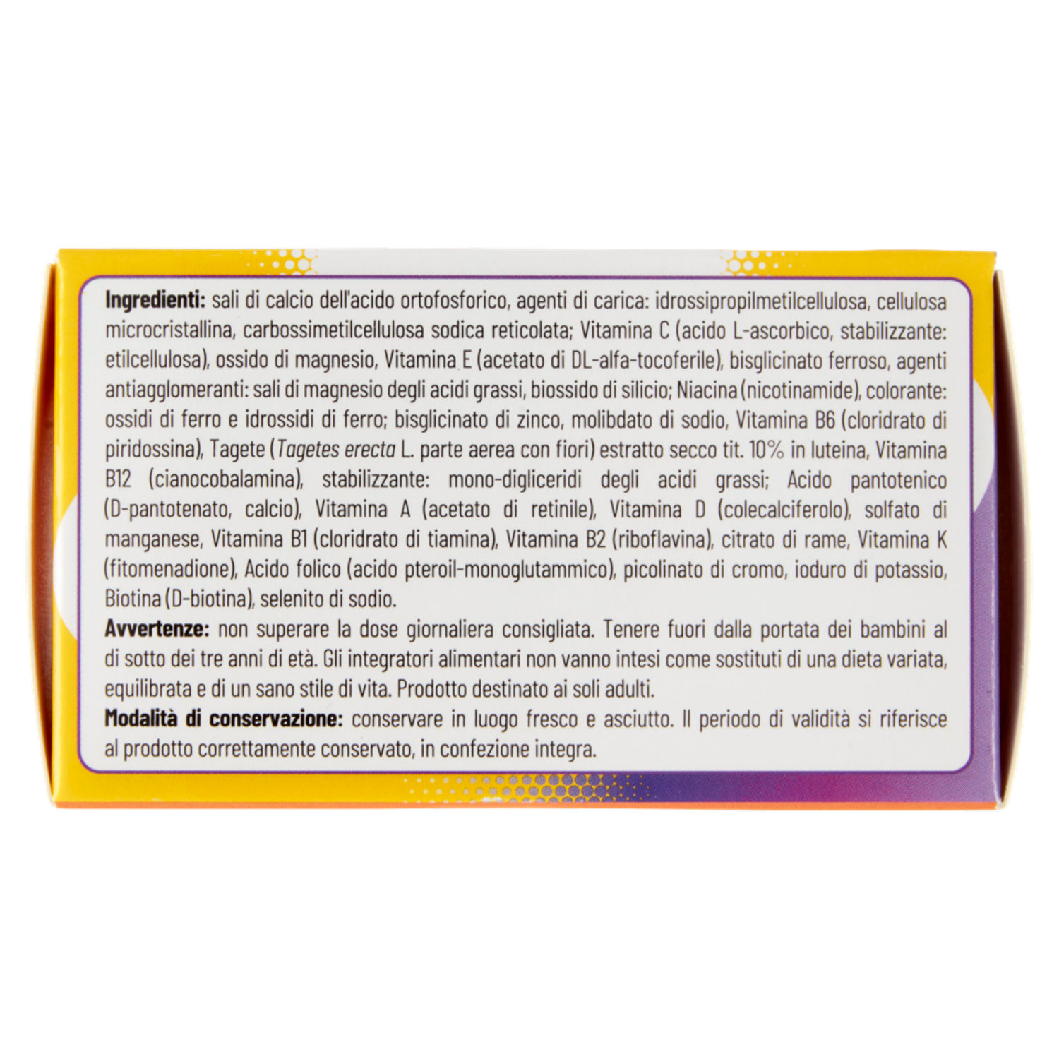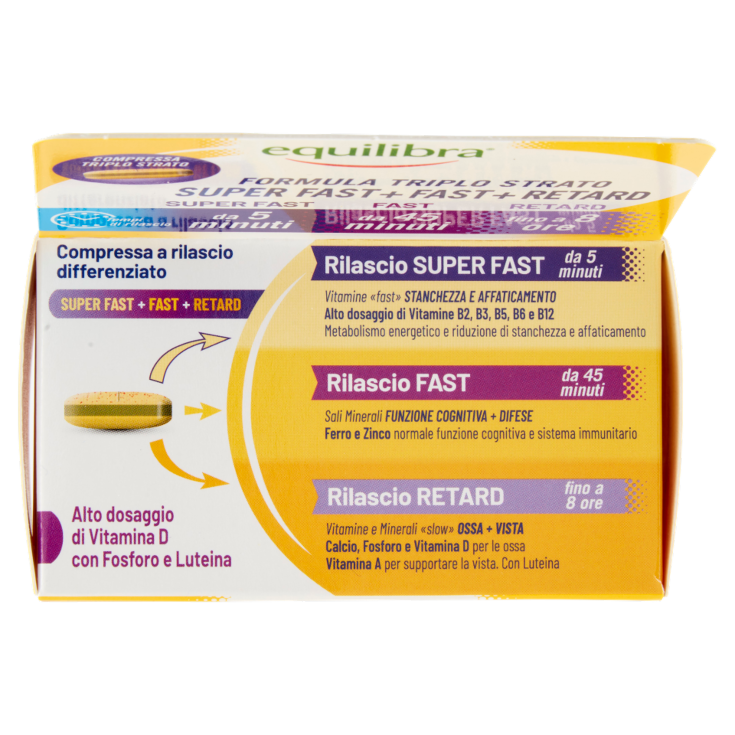 Multivitamine & Minerali 50+ Equilibra è un integratore alimentare a base di Vitamine e Minerali in compresse triplo strato formulate con tecnologia innovativa Super Fast + Fast + Retard che permette un rilascio graduale nel tempo delle vitamine e dei minerali. Formula completa studiata per le esigenze specifiche degli adulti con più di 50 anni. Strato Super Fast - Alto dosaggio di Vitamine del Gruppo B - formulato per contribuire al normale metabolismo energetico e alla riduzione di stanchezza e affaticamento grazie alle Vitamine B2, B3, B5, B6 e B12. Strato Fast utile per la normale funzione cognitiva grazie a Ferro, Iodio e Zinco. Ferro, Rame, Selenio e Zinco contribuiscono inoltre alla normale funzione del sistema immunitario. Strato Retard per il mantenimento di ossa normali grazie a Calcio, Fosforo e Vitamina D. Con Vitamina A per la normale capacità visiva. Con Luteina. Compressa a rilascio differenziato Super fast + fast + retard Rilascio Super Fast da 5 minuti Vitamine «fast» Stanchezza e Affaticamento Alto dosaggio di Vitamine B2, B3, B5, B6 e B12 Metabolismo energetico e riduzione di stanchezza e affaticamento Rilascio Fast da 45 minuti Sali Minerali Funzione Cognitiva + Difese Ferro e Zinco normale funzione cognitiva e sistema immunitario Rilascio Retard fino a 8 ore Vitamine e Minerali «slow» Ossa + Vista Calcio, Fosforo e Vitamina D per le ossa Vitamina A per supportare la vista. Con Luteina Alto dosaggio di Vitamina D con Fosforo e Luteina