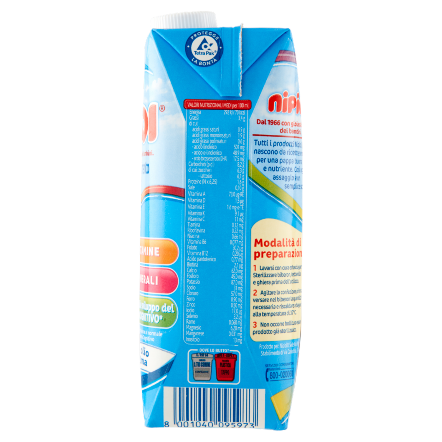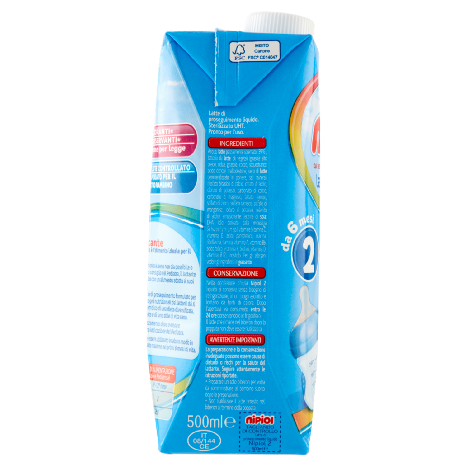 Prodotto confezionato in atmosfera protettiva Conservazione Nella confezione chiusa Nipiol 2 liquido si conserva senza bisogno di refrigerazione, in un luogo asciutto e lontano da fonti di calore. Dopo l'apertura va consumato entro le 24 ore conservandolo in frigorifero. Il latte che rimane nel biberon dopo la poppata non deve essere riutilizzato.