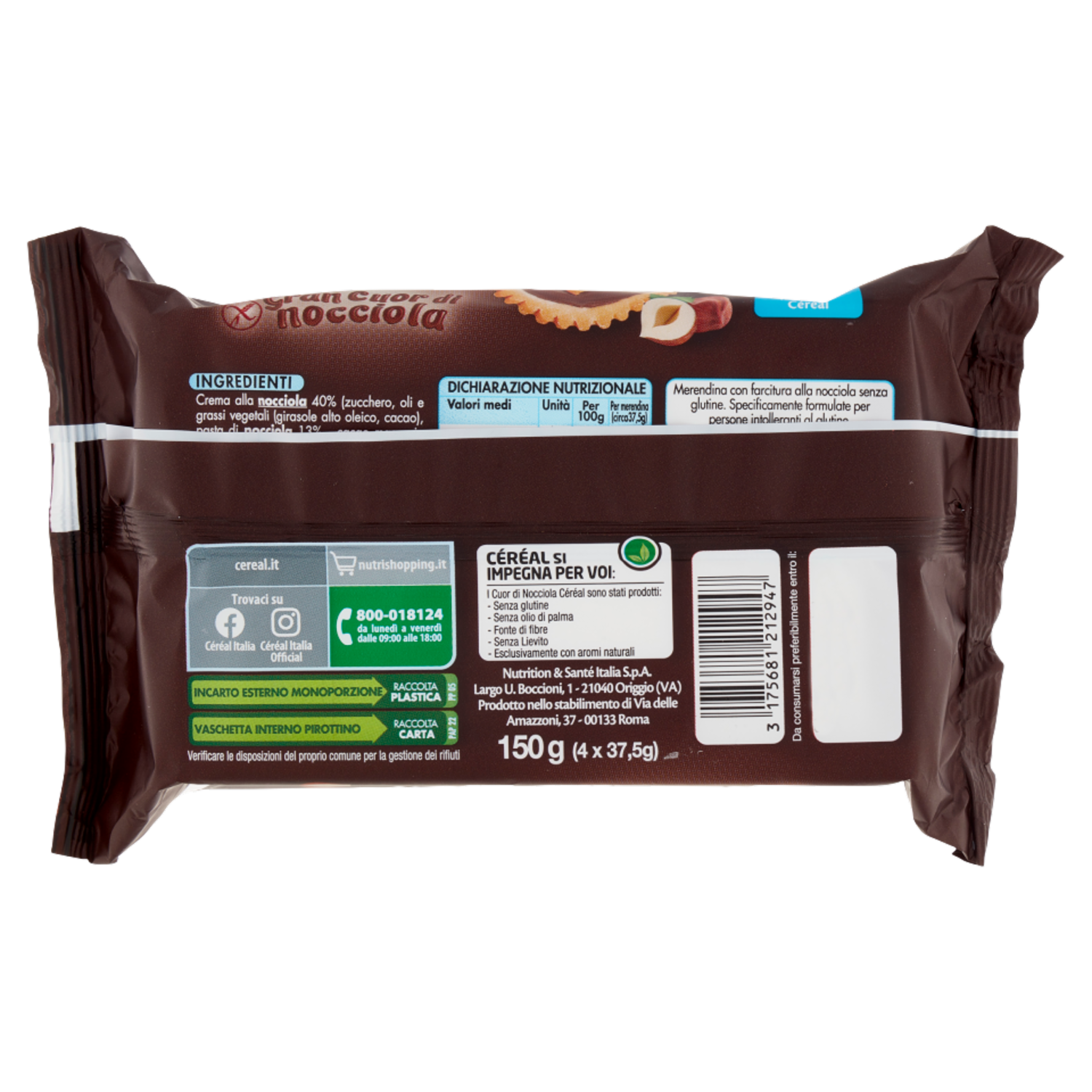 Céréal Senza Glutine Crostatine Gran Cuor di nocciola, senza olio di palma, 4 monodose x 37,5 g