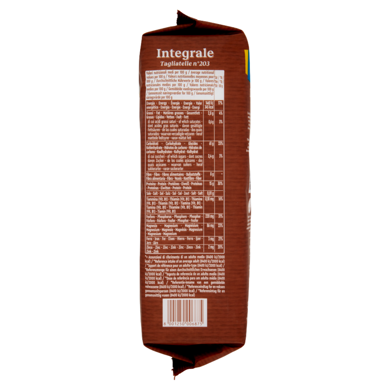 La pasta integrale De Cecco è naturalmente ricca di fibre e fosforo e naturalmente fonte di proteine, ferro, tiammina (vit. B1), magnesio e zinco